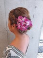 ふわふわ編み込みアップスタイル。ポイントで生花を飾りセレブ感アップ!