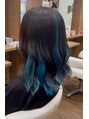 カットはワンレングス外ハネボブナチュラルに!カラーは黒染めをしていためトリプルカラー、ベースは人気のグレージュで毛先にビビットなターコイズブルーでグラデーションカラーに仕上げました!
