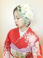 シンプルなボブに白を基調としたお花達(オリジナル生花の髪飾り)をつけたヘアアレンジ。fleurでは提携したお花屋さんからスタイリストが自ら買い付け、お着物の柄やご希望にあった生花のヘッドアクセサリーを制作させて頂いております。