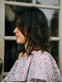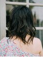 鎖骨の長さで毛先を軽めにカット。バングは流して、バックにつながるように少し長めにカットします。ベースはダークブラウンで、少し太めにハイライトを入れて立体感の出やすいようにカラーしました。