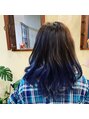 - 表面は細くメッシュを入れ、毛先はバレーイヤージュをしてダブルカラーをした後ブルーベースを入れ完成