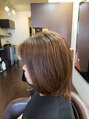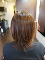 セミロングスタイルです。ベースにアッシュでやや明るめに染めて、ローライトで色の立体感が出るようにしてます。