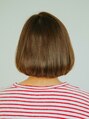 少し前下がりで丸いシルエットのアゴ下ボブ。毛先に重さを残してカットしているのでバングは短めで束感を出して重たくなりすぎないようにバランスを取っています。カラーリングは赤みのないナチュラルなブラウンカラー。