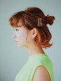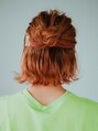 オレンジカラーに染めたボブを波巻きにして立体感を出します! ハーフアップにして一度結び、結んだ髪を結び目に巻き付けてお団子スタイルにします。
