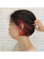 ショートボブのインナーカラーです。一度ブリーチをしてから、赤のマニキュアでイメージチェンジ!!耳掛けした時にしっかり見えるように、おろしたときは隠せるようにしてあります。