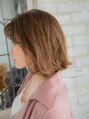肩につくかつかないかくらいの重ためなカットラインのボブスタイル。 春らしく、軽やかに見せるため、カラーリングは明るめで、透明感の出る薄いピンクベージュに。バングもシースルーで軽く。巻いてオン眉の長さで可愛らしく。