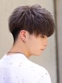 サイド、襟足を刈り上げたマッシュスタイル。カラーはブリーチをしてから、グレージュをオン。
