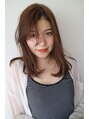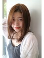 セミロングのナチュラルストレートヘア。カラーは柔らかく見える明るめのハニーベージュ。メイクはオレンジメイクを合わせて大人のヘルシーな色っぽさを。