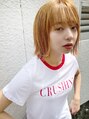 ブリーチしてからオレンジベージュ。量を適度に軽くしています。重く見えないスッキリとしたシルエットにしています。人気のヘアスタイルです。スタイリングも簡単です。