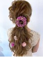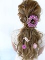 ルーズなローポニースタイルに、ドライフラワーをつけてます。ドライフラワー飾りは店舗では販売してません。