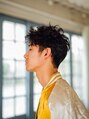 パーマで毛先に動きをつけたショートスタイル!アップバングで爽やかワイルドな印象に!!ランダムな毛先の動きと無造作な質感がポイントです。カラーはブラウングレーアッシュで透明感を演出。王道モテヘアーです!!