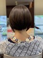 長さの差をつけた前下がりショート。襟足がギリギリまで短くしてあるので首が長く見えます。バックだけ段をいれてふわっとしやすいスタイルになっています。ショートスタイルはお任せください。カラーは8レベルのベージュブラウン
