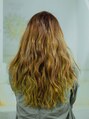 全体的を巻いて動きを出しているカジュアルなロングヘアスタイル!根元から毛先にかけて明るくなるイエローのツートーンカラーは個性的で目を引く印象的なデザインになっています。