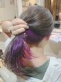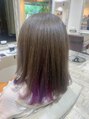 表面はイルミナカラーのブルーで綺麗なアッシュ感を☆内側はブリーチ1回に、上からカラーバターのブルーバイオレットとピンクパープルをランダムに入れて、巻いても結んでもオシャレなスタイルです!