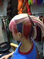 もともベースは明るい髪だったので、ブリーチはリタッチのみ、ホワイト、インナーと刈り上げ部分はピンクと青。