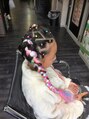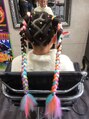 レインボーラバーでブロッキングしてから、ツインテールにし、カラフルワッフルを編み込めば、派手可愛いキッズダンサーの完成でございます。