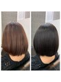 ブルーブラック風の色味で落ち着かせるカラーリングにより、黒染めを使わずどんな職場でもOKな髪色です☆切りっぱなしの前下がりボブなので、顔まわりの骨格もカバーできます♪