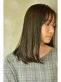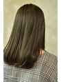 暗めのグレージュカラーでも透け感のあるつやつやストレートで柔らかな印象に。