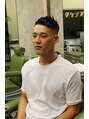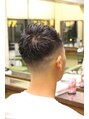 周りはスキンフェードでフェードカットして刈り上げたトップは束間を意識したスライドカットと前髪はアップバングで横に流したスタイルです!
