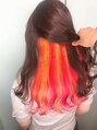 お客様からのオーダーカラー、赤系ベースにイエローオレンジのストライプカラーをミックスしたインナーカラー。個性的なカラーもご相談ください。