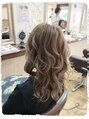 ブリーチはハイライトのみでのハイトーンスモーキーブロンド♪♪今っぽいゆる巻きで外国人風テイストヘアに☆ヘアカラーは1度ではなく2度・3度と重ねていくのがステキなヘアになる秘訣です(^_-)-☆