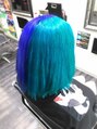 もともとブリーチ毛でしたので、根元のみブリーチリタッチをした後、左を青紫に、右をターコイズカラーにいたしました。