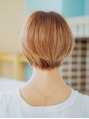 カットは前下がりのショートボブに切って、バングも少し短めの可愛いスタイル。カラーはブリーチをしたハイトーン。ベージュカラーにすることで、綺麗なカラーに。