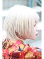カットは顔まわりに前下がりで収まってくる「前下がりウルフ」に。カラーはケアブリーチで4回ブリーチをして作るツヤツヤのホワイトカラー。ホワイトカラー希望の方はブリーチ回数が個人差がありますので一度お問い合わせ下さい。