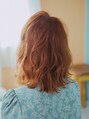 前髪も含めて全体的にコテで強めに巻きスタイリングすることでふわっとした動きの出るデザインと女の子らしくてかわいいシルエットになります。カラーも暖色系の明るめのカラーなので柔らかい印象がでるのでおすすめです。