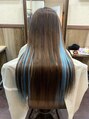 全体は元の髪色を活かしたモカ系ブラウン。スカイブルーのメッシュを入れたいとのことでしたので、満遍なく付けるよりポイントで付ける方が可愛いので、場所を決めて付けました。ボリューム重視なのでシールエクステ80本付いています。