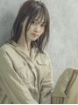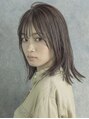 肩に当り自然にハネるミディアムスタイルです。人気のグレージュカラーで硬い髪質も柔らかく見せます。前髪は薄くウェットな質感が今っぽくてオススメです。
