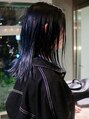 ミディアムスタイルをワンブリーチしてネイビーブルーをオン。さりげないブラックカラーはもちがよく色落ちも綺麗です。