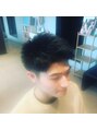 アップバングベリーショート、刈り上げを目立たせつつ前髪は中央部分でけあげるのでいかつさは抑えて爽やかな印象に。