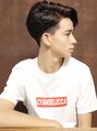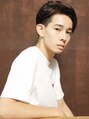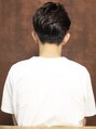 アウトラインを短くツーブロックにした七三ショートスタイル。パートラインを目の外側ぐらいで決めて七三に分け、トップと前髪をやや長めに残す事で毛流れができやすくしています。