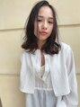 切りっぱなし外ハネロブ。レイヤーの入れたくびれスタイル。前髪は、流しめにカットして抜け感になるように。カラーは、アッシュグレージュで透明感に。