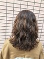 17ミリから20ミリのロットで根元から巻いて、ふんわりパーマをかけました。カラーはリタッチですが、ハイライトとローライトが入っていますので、ウェーブがより立体的にみえます。