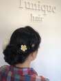 卒業式の前撮りスタイル。ゆるふわな崩したスタイルとは違い、面や艶を意識して和装らしく仕上げました。