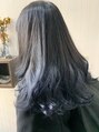 毛先ブリーチしたグラデーションカラーになります。暗髪のネイビーですが色落ちも綺麗でコテで巻くと透け感がでます。明るめのブルーにしたい方や髪の状態、髪質に応じてブリーチ回数が変わりますのでブックマークして頂きご相談下さい。