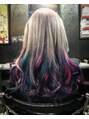 ブリーチ2回後ONシルバー系のベースに、ピンク、青、ムラサキの3色をランダムに入れました。ブリーチ1回だと・・・・きれいに発色しないので、ブリーチ2回は必須です。