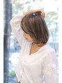 斜めバングを流しやすくするために前髪のみパーマをかけていて簡単スタイリングできるようにしています!前髪を流すことにより大人さがでます。カラーは、ブラウンとベージュを混ぜ合わせたブランジュカラーで透明感をプラスしました!!