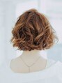 顎下レングスのショートボブにランダムで大きめのカールをつけたスタイルです。全体に大きくカールがかかっているので、しっかりと段をいれてボリュームがですぎないようにカットしています。