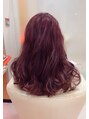 全体にブリーチをして、暗めのピンクカラーをオンカラーしました。透明感もあって 巻いたりするととても綺麗な色です。