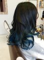 根元は白髪をカバーしつつ、毛先をグラデーションブリーチし、さらにブルーのグラデーションでカラーONしてあります。光に透けると全体的にブルーをより感じ、毛先に行くにつれ鮮やかになっていってキレイですよ(^^)