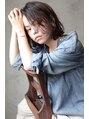 顔周りのゆるめカールがアンニュイなボブスタイル。肩につかないくらいの重めロブ。ダメージを抑えたクラフトパーマでカジュアルに、半乾きでウェットスタイリング。