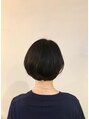 バングを眉上で厚めにカットしたマッシュボブ。ドライカットで自然な丸みを。