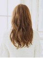 表面に軽くレイヤーが入ったロングスタイルでカラーは透け感のある柔らかいベージュ系ブラウン。 中間から毛先にかけて大きいウェーブをつけ、巻いている感があまりない抜け感を目指しました。