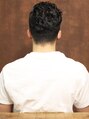 アウトラインを短く刈り上げたパーマスタイルです。サイドでパートラインを作り、横に流せるようにトップは長めに切り、逆側はパートラインまで短くカットし、短い所とトップとの長短をつけたメリハリのあるスタイルにしています。
