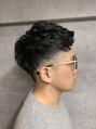 メリハリのあるアップバングショートです。襟足とサイドは刈り上げてツーブロックに、後頭部の丸みが綺麗に見えるよう「丸みをつけて毛流れに沿ってアップバングに流れるようにスタイリング。どの角度から見ても格好良いヘアスタイルになっています。