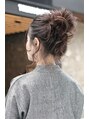 お団子アレンジ。トップで一本にゴムで結んで、ゴムに毛先を巻き付けるようにしてピンでとめます。ルーズに毛束を崩してスプレーで束感をしっかりだすのがポイント!後れ毛もコテで巻くと可愛いです♪