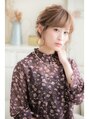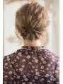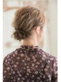 全体に波巻きにして、おくれ毛を残してミドルの高さにポニーテール。残った毛をねじりながらゴムを隠すように留める。